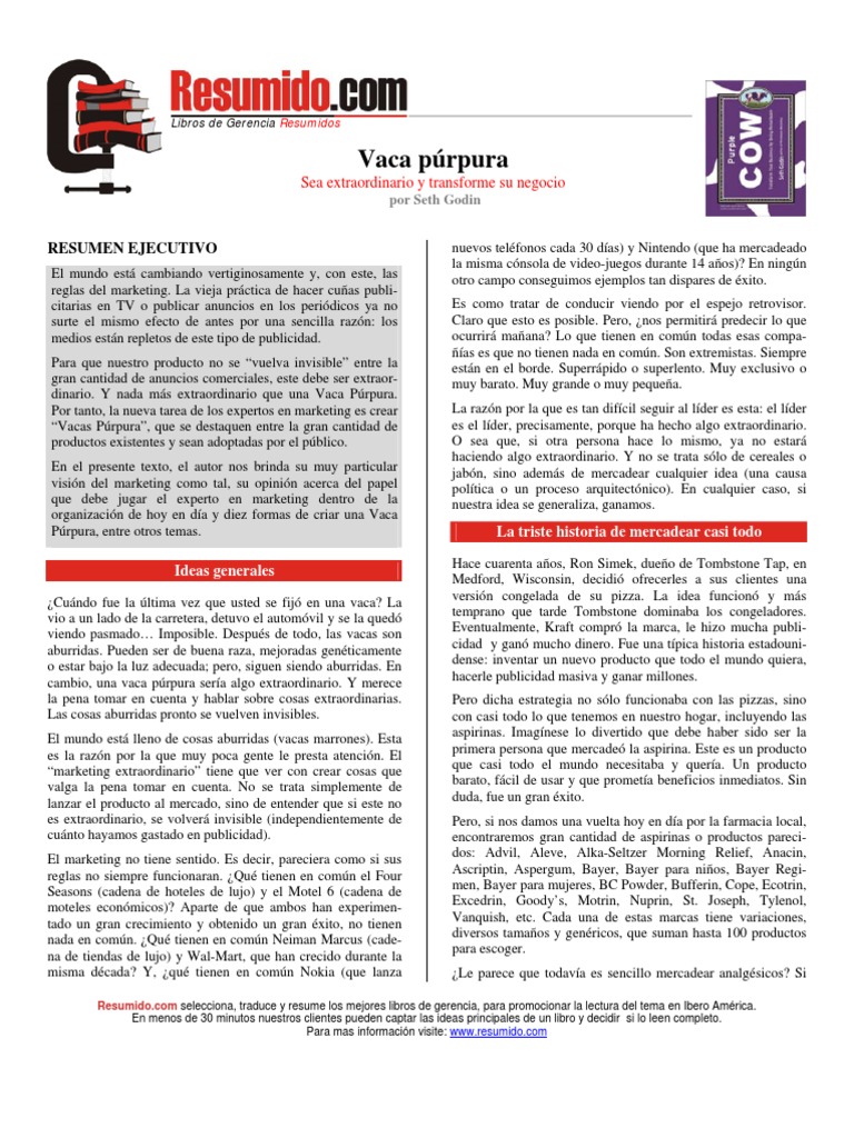 En el resumen de esta semana vamos a ver la vaca púrpura (purple cow, 2003) del gurú del marketing seth godin, en el que vemos la nueva función del marketing en las organizaciones y muchas formas de hacer que nuestros productos se. Transform your business by being remarkable. Resumen del libro la vaca púrpura de seth godin purple cow : Para que nuestro producto no se vuelva invisible en esta nebulosa de opciones debemos hacerlo extraordinario, diferenciarlo. Un libro destinado para expertos en temas relacionados al marketing.
